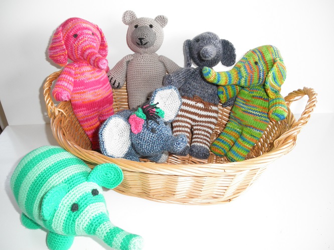 Mange forskellige syede, strikkede og hæklede legedyr og dørstoppere.